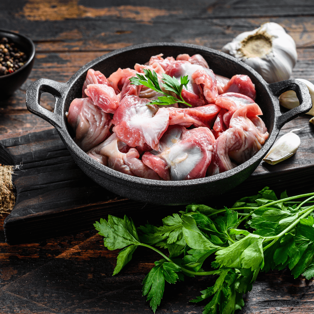 Molleja de pollo fresca, compuesta por el músculo y el tejido conectivo.